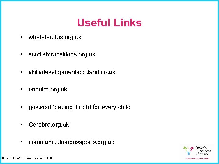 Useful Links • whataboutus. org. uk • scottishtransitions. org. uk • skillsdevelopmentscotland. co. uk • enquire. org. uk • gov. scot. getting it right for every child • Cerebra. org. uk • communicationpassports. org. uk Copyright Down’s Syndrome Scotland 2009 ©