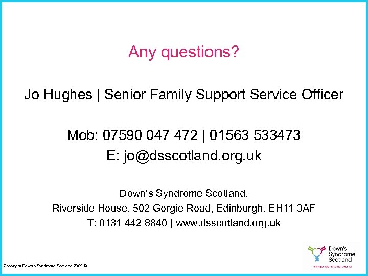 Any questions? Jo Hughes | Senior Family Support Service Officer Mob: 07590 047 472 | 01563 533473 E: jo@dsscotland. org. uk Down’s Syndrome Scotland, Riverside House, 502 Gorgie Road, Edinburgh. EH 11 3 AF T: 0131 442 8840 | www. dsscotland. org. uk Copyright Down’s Syndrome Scotland 2009 ©