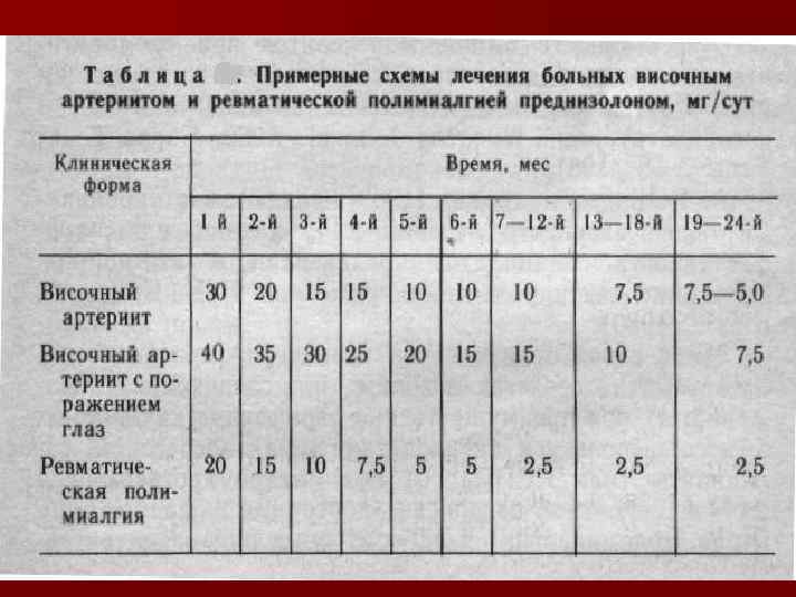 При приеме преднизолона в дозе 1 мг/кг в день симптомы уменьшаются в течение 1— 2 дней или недели, а через месяц лечения нормализуются клинические и лабораторные показатели, в частности СОЭ. Если полная ремиссия не достигается, то добавляют цитотоксические и иммуносупрессивные агенты: дапсон, метотрексат, азатиоприн, циклофосфан или цефалоспорин.