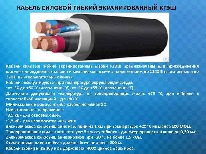 КАБЕЛЬ СИЛОВОЙ ГИБКИЙ ЭКРАНИРОВАННЫЙ КГЭШ Кабели силовые гибкие экранированные марки КГЭШ предназначены для присоединения шахтных передвижных машин и механизмов к сети с напряжением до 1140 В на основных и до 220 В на вспомогательных жилах. Кабели эксплуатируются при температуре окружающей среды: • от -30 до +50 °С (исполнение У); от -10 до +55 °С (исполнение Т). Длительно допустимая температура на токопроводящих жилах +75 °С, для кабелей с теплостойкой изоляцией – до +90 °С Минимальный радиус изгиба кабеля не менее 5 D. Испытательное напряжение: • 3, 5 к. В - для основных жил; • 1, 5 к. В - для вспомогательных жил. Электрическое сопротивление изоляции на 1 км при температуре +20 °С не менее 100 МОм. Токопроводящие жилы соответствуют 5 классу гибкости, диаметр проволок в жиле до 0, 50 мм. Электрическое сопротивление экранов при +20 °С не более 1, 5 к. Ом. Строительная длина кабеля должна быть не менее 200 м. Кабели стойки к изгибу и выдерживают 4000 циклов перегибов.