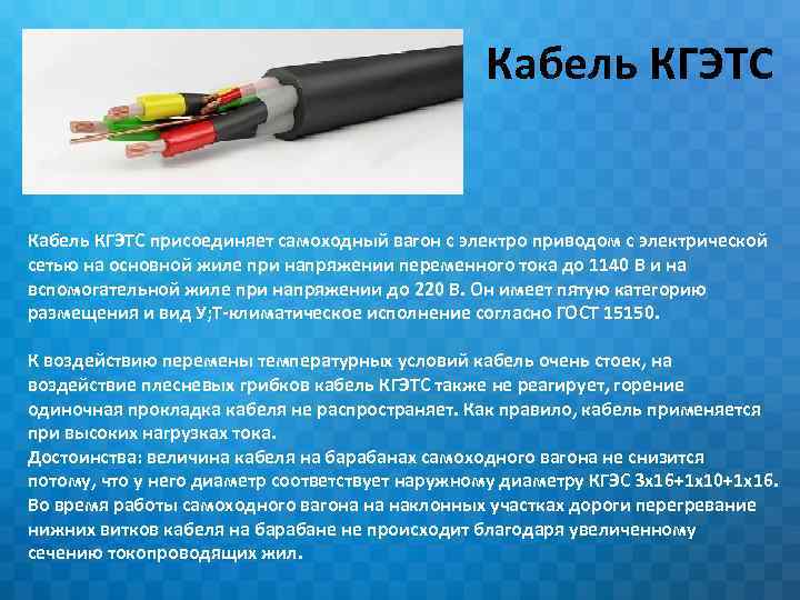 Кабель КГЭТС присоединяет самоходный вагон с электро приводом с электрической сетью на основной жиле при напряжении переменного тока до 1140 В и на вспомогательной жиле при напряжении до 220 В. Он имеет пятую категорию размещения и вид У; Т-климатическое исполнение согласно ГОСТ 15150. К воздействию перемены температурных условий кабель очень стоек, на воздействие плесневых грибков кабель КГЭТС также не реагирует, горение одиночная прокладка кабеля не распространяет. Как правило, кабель применяется при высоких нагрузках тока. Достоинства: величина кабеля на барабанах самоходного вагона не снизится потому, что у него диаметр соответствует наружному диаметру КГЭС 3 х16+1 х10+1 х16. Во время работы самоходного вагона на наклонных участках дороги перегревание нижних витков кабеля на барабане не происходит благодаря увеличенному сечению токопроводящих жил.