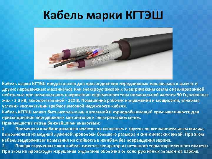 Кабель марки КГТЭШ предназначен для присоединения передвижных механизмов в шахтах и других передвижных механизмов или электроустановок к электрическим сетям с изолированной нейтралью при номинальном напряжении переменного тока номинальной частоты 50 Гц основных жил - 3, 3 к. В, вспомогательной - 220 В. Повышение рабочих напряжений и мощностей, тяжелые условия эксплуатации требуют высокой надежности кабеля. Кабель КГТЭШ может быть использован в угольной и горнодобывающей промышленности для присоединения передвижных механизмов к электрическим сетям. Преимущества перед ближайшими аналогами: 1. Применена комбинированная оплетка по основным и группы по вспомогательным жилам, выполненная из медной луженой проволоки большего размера и синтетических нитей. При этом кабель выдерживает испытания на стойкость к изгибам без повреждения экрана. 2. Поверх скрученных жил кабеля имеется сепаратор из нетканого термоскрепленного полотна. При этом не происходит нарушения отделения оболочки от конструктивных элементов кабеля.
