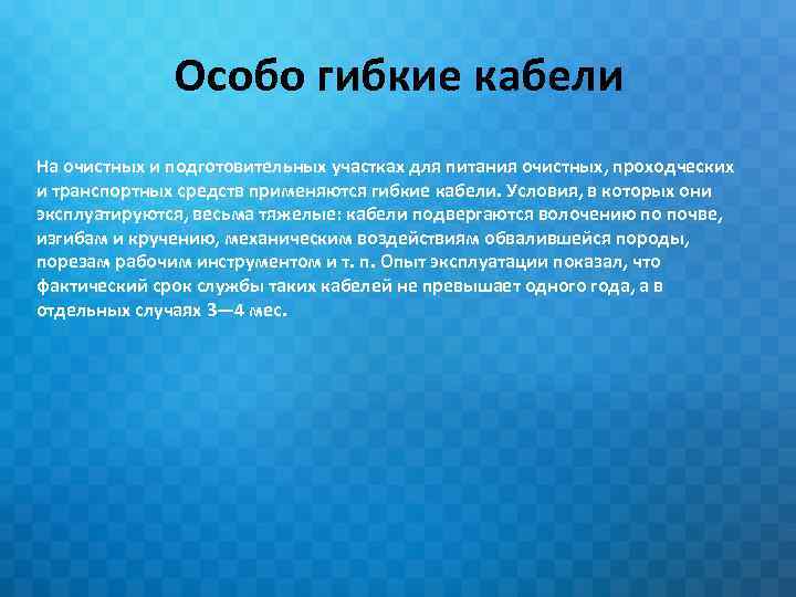 Особо гибкие кабели На очистных и подготовительных участках для питания очистных, проходческих и транспортных средств применяются гибкие кабели. Условия, в которых они эксплуатируются, весьма тяжелые: кабели подвергаются волочению по почве, изгибам и кручению, механическим воздействиям обвалившейся породы, порезам рабочим инструментом и т. п. Опыт эксплуатации показал, что фактический срок службы таких кабелей не превышает одного года, а в отдельных случаях 3— 4 мес.