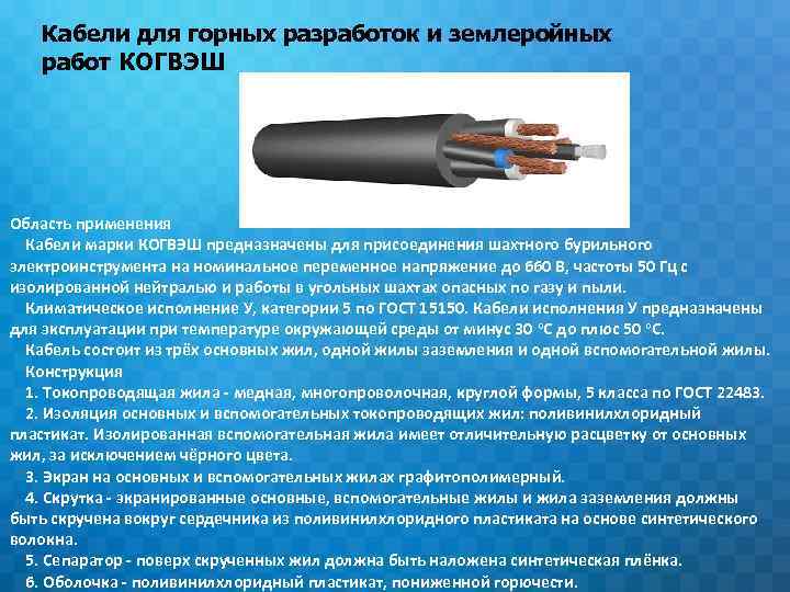 Кабели для горных разработок и землеройных работ КОГВЭШ Область применения Кабели марки КОГВЭШ предназначены для присоединения шахтного бурильного электроинструмента на номинальное переменное напряжение до 660 В, частоты 50 Гц с изолированной нейтралью и работы в угольных шахтах опасных по газу и пыли. Климатическое исполнение У, категории 5 по ГОСТ 15150. Кабели исполнения У предназначены для эксплуатации при температуре окружающей среды от минус 30 о. С до плюс 50 о. С. Кабель состоит из трёх основных жил, одной жилы заземления и одной вспомогательной жилы. Конструкция 1. Токопроводящая жила - медная, многопроволочная, круглой формы, 5 класса по ГОСТ 22483. 2. Изоляция основных и вспомогательных токопроводящих жил: поливинилхлоридный пластикат. Изолированная вспомогательная жила имеет отличительную расцветку от основных жил, за исключением чёрного цвета. 3. Экран на основных и вспомогательных жилах графитополимерный. 4. Скрутка - экранированные основные, вспомогательные жилы и жила заземления должны быть скручена вокруг сердечника из поливинилхлоридного пластиката на основе синтетического волокна. 5. Сепаратор - поверх скрученных жил должна быть наложена синтетическая плёнка. 6. Оболочка - поливинилхлоридный пластикат, пониженной горючести.