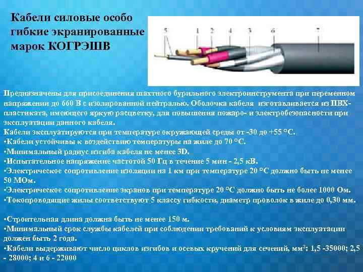 Кабели силовые особо гибкие экранированные марок КОГРЭШВ Предназначены для присоединения шахтного бурильного электроинструмента при переменном напряжении до 660 В с изолированной нейтралью. Оболочка кабеля изготавливается из ПВХпластиката, имеющего яркую расцветку, для повышения пожаро- и электробезопасности при эксплуатации данного кабеля. Кабели эксплуатируются при температуре окружающей среды от -30 до +55 °С. • Кабели устойчивы к воздействию температуры на жиле до 70 °С. • Минимальный радиус изгиба кабеля не менее 3 D. • Испытательное напряжение частотой 50 Гц в течение 5 мин - 2, 5 к. В. • Электрическое сопротивление изоляции на 1 км при температуре 20 °С должно быть не менее 50 МОм. • Электрическое сопротивление экранов при температуре 20 °С должно быть не более 1000 Ом. • Токопроводящие жилы соответствуют 5 классу гибкости, диаметр проволок в жиле до 0, 30 мм. • Строительная длина должна быть не менее 150 м. • Минимальный срок службы кабелей при соблюдении требований к условиям эксплуатации должен быть 2 года. • Кабели выдерживают число циклов изгибов и осевых кручений для сечений, мм 2: 1, 5 -35000; 2, 5 - 28000; 4 и 6 - 22000