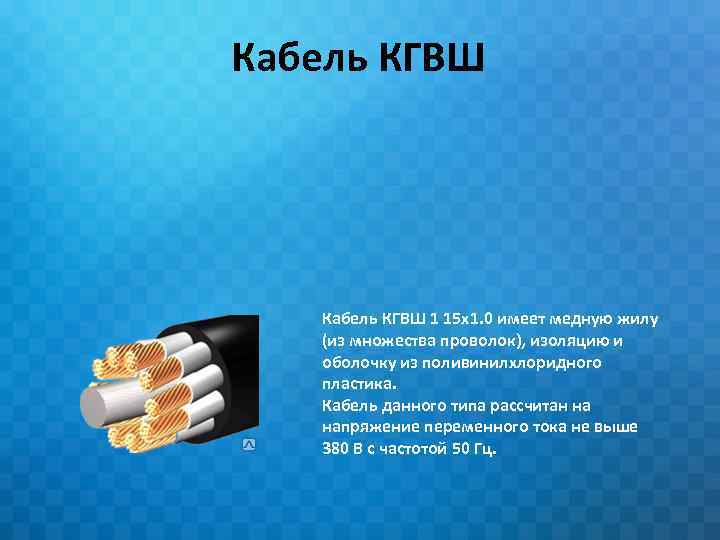 Кабель КГВШ 1 15 х1. 0 имеет медную жилу (из множества проволок), изоляцию и оболочку из поливинилхлоридного пластика. Кабель данного типа рассчитан на напряжение переменного тока не выше 380 В с частотой 50 Гц.