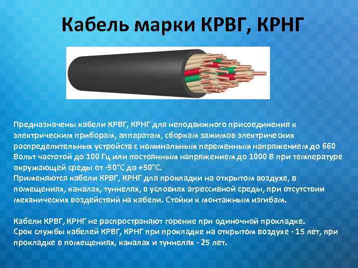 Кабель марки КРВГ, КРНГ Предназначены кабели КРВГ, КРНГ для неподвижного присоединения к электрическим приборам, аппаратам, сборкам зажимов электрических распределительных устройств с номинальным переменным напряжением до 660 Вольт частотой до 100 Гц или постоянным напряжением до 1000 В при температуре окружающей среды от -50°С до +50°С. Применяются кабели КРВГ, КРНГ для прокладки на открытом воздухе, в помещениях, каналах, туннелях, в условиях агрессивной среды, при отсутствии механических воздействий на кабели. Стойки к монтажным изгибам. Кабели КРВГ, КРНГ не распространяют горение при одиночной прокладке. Срок службы кабелей КРВГ, КРНГ при прокладке на открытом воздухе - 15 лет, при прокладке в помещениях, каналах и туннелях - 25 лет.