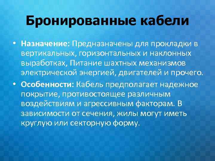 Бронированные кабели • Назначение: Предназначены для прокладки в вертикальных, горизонтальных и наклонных выработках, Питание шахтных механизмов электрической энергией, двигателей и прочего. • Особенности: Кабель предполагает надежное покрытие, противостоящее различным воздействиям и агрессивным факторам. В зависимости от сечения, жилы могут иметь круглую или секторную форму.