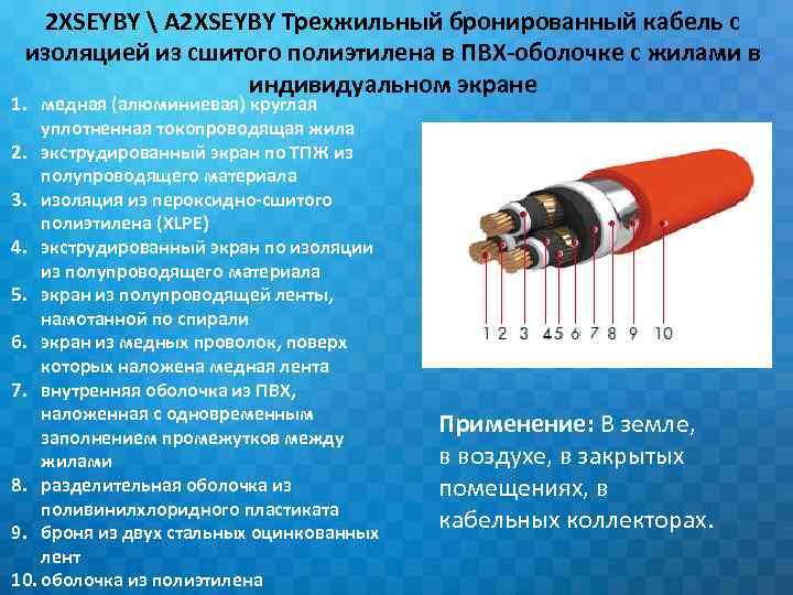 2 XSEYBY A 2 XSEYBY Трехжильный бронированный кабель с изоляцией из сшитого полиэтилена в ПВХ-оболочке с жилами в индивидуальном экране 1. медная (алюминиевая) круглая уплотненная токопроводящая жила 2. экструдированный экран по ТПЖ из полупроводящего материала 3. изоляция из пероксидно-сшитого полиэтилена (XLPE) 4. экструдированный экран по изоляции из полупроводящего материала 5. экран из полупроводящей ленты, намотанной по спирали 6. экран из медных проволок, поверх которых наложена медная лента 7. внутренняя оболочка из ПВХ, наложенная с одновременным заполнением промежутков между жилами 8. разделительная оболочка из поливинилхлоридного пластиката 9. броня из двух стальных оцинкованных лент 10. оболочка из полиэтилена Применение: В земле, в воздухе, в закрытых помещениях, в кабельных коллекторах.