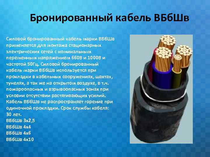 Бронированный кабель ВБб. Шв Силовой бронированный кабель марки ВБб. Шв применяется для монтажа стационарных электрических сетей с номинальным переменным напряжением 660 В и 1000 В и частотой 50 Гц. Силовой бронированный кабель марки ВБб. Шв используется при прокладки в кабельных сооружениях, шахтах, тунелях, а так же на открытом воздухе, в т. ч. пожароопасных и взрывоопасных зонах при условии отсутствии растягивающих усилий. Кабель ВБб. Шв не распространяет горение при одиночной прокладки. Срок службы кабеля: 30 лет. ВБб. Шв 3 х2, 5 ВБб. Шв 4 х4 ВБб. Шв 4 х6 ВБб. Шв 4 х10