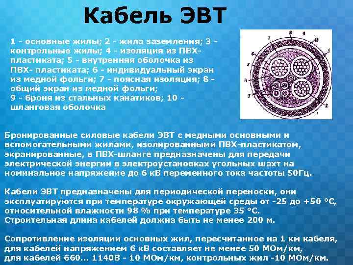 Кабель ЭВТ 1 - основные жилы; 2 - жила заземления; 3 контрольные жилы; 4 - изоляция из ПВХпластиката; 5 - внутренняя оболочка из ПВХ- пластиката; 6 - индивидуальный экран из медной фольги; 7 - поясная изоляция; 8 общий экран из медной фольги; 9 - броня из стальных канатиков; 10 шланговая оболочка Бронированные силовые кабели ЭВТ с медными основными и вспомогательными жилами, изолированными ПВХ-пластикатом, экранированные, в ПВХ-шланге предназначены для передачи электрической энергии в электроустановках угольных шахт на номинальное напряжение до 6 к. В переменного тока частоты 50 Гц. Кабели ЭВТ предназначены для периодической переноски, они эксплуатируются при температуре окружающей среды от -25 до +50 °С, относительной влажности 98 % при температуре 35 °С. Строительная длина кабелей должна быть не менее 200 м. Сопротивление изоляции основных жил, пересчитанное на 1 км кабеля, для кабелей напряжением 6 к. В составляет не менее 50 МОм/км, для кабелей 660. . . 1140 В - 10 МОм/км, контрольных жил -10 МОм/км.