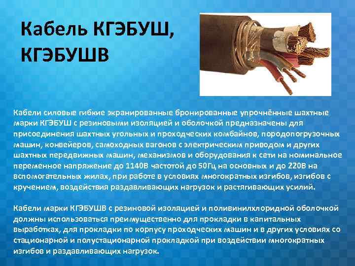 Кабель КГЭБУШ, КГЭБУШВ Кабели силовые гибкие экранированные бронированные упрочнённые шахтные марки КГЭБУШ с резиновыми изоляцией и оболочкой предназначены для присоединения шахтных угольных и проходческих комбайнов, породопогрузочных машин, конвейеров, самоходных вагонов с электрическим приводом и других шахтных передвижных машин, механизмов и оборудования к сети на номинальное переменное напряжение до 1140 В частотой до 50 Гц на основных и до 220 В на вспомогательных жилах, при работе в условиях многократных изгибов, изгибов с кручением, воздействия раздавливающих нагрузок и растягивающих усилий. Кабели марки КГЭБУШВ с резиновой изоляцией и поливинилхлоридной оболочкой должны использоваться преимущественно для прокладки в капитальных выработках, для прокладки по корпусу проходческих машин и в других условиях со стационарной и полустационарной прокладкой при воздействии многократных изгибов и раздавливающих нагрузок.