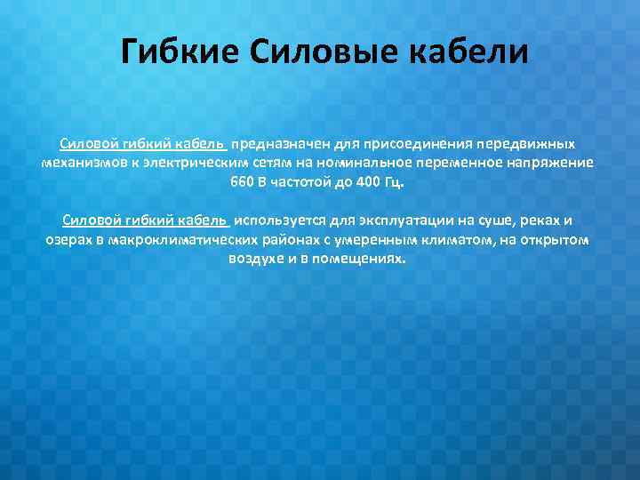 Гибкие Силовые кабели Силовой гибкий кабель предназначен для присоединения передвижных механизмов к электрическим сетям на номинальное переменное напряжение 660 В частотой до 400 Гц. Силовой гибкий кабель используется для эксплуатации на суше, реках и озерах в макроклиматических районах с умеренным климатом, на открытом воздухе и в помещениях.