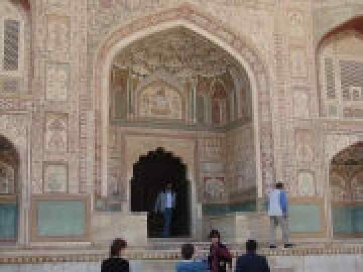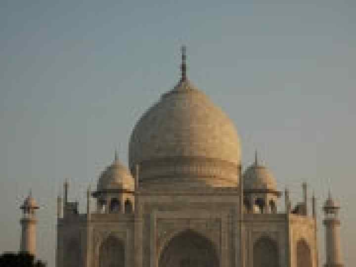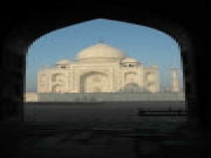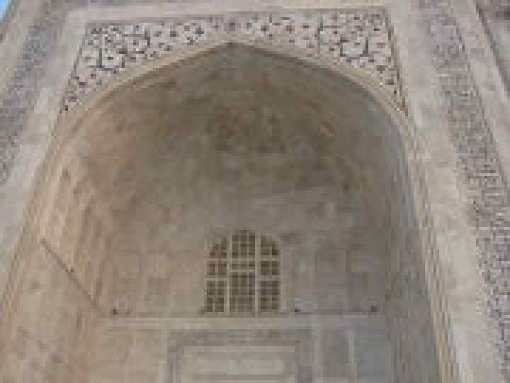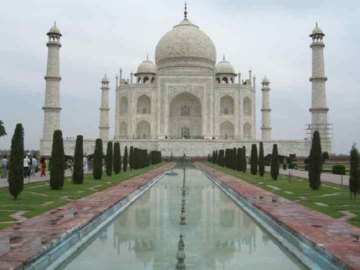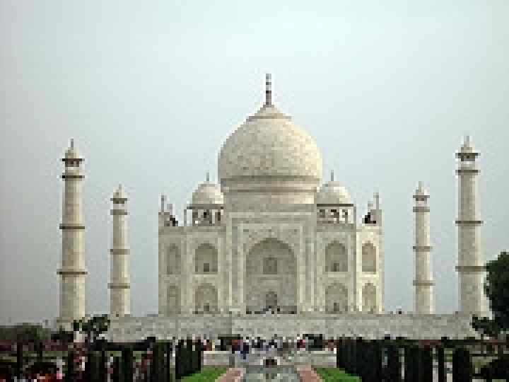 Тадж-Махал ► Тадж-Маха л (хинди त ज महल ) — мавзолей-мечеть, находящийся в Агре, Индия, на берегу р. Ямуна (архитекторы, вероятно, Устад-Иса и др. ). Построен по приказу императора Великих Моголов Шах-Джахана в память о жене Мумтаз-Махал, умершей при родах (позже здесь был похоронен и сам Шах-Джахан). Внутри мавзолея расположены две гробницы — шаха и его жены. На самом деле, место их захоронения находится там же, где и гробницы, но под землей. Время строительства относится примерно к 1630 -1652 гг. Тадж-махал представляет собой пятикупольное сооружение высотой 74 м. на платформе, с 4 минаретами по углам (они слегка наклонены в сторону от усыпальницы для того, чтобы в случае разрушения не повредить её), к которому примыкает сад с фонтанами и бассейном. Стены выложены из полированного полупрозрачного с инкрустацией из самоцветов. Были использованы бирюза, агат, малахит, сердолик и др. Мрамор имеет такую особенность, что при ярком дневном свете он выглядит белым, на заре он выглядит розовым, а в лунную ночь серебристым. На строительство комплекса было приглашено более 20 000 мастеров со всех концов империи, а также мастера Средней Азии, Персии и Ближнего Востока.