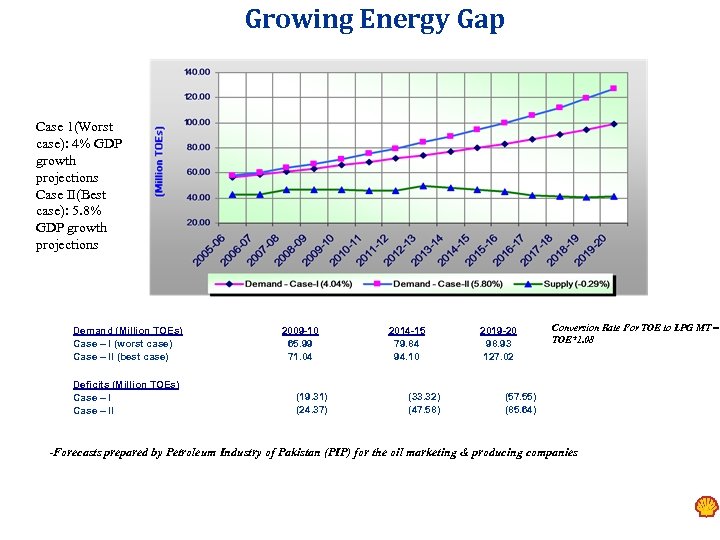 Growing Energy Gap Case 1(Worst case): 4% GDP growth projections Case II(Best case): 5. 8% GDP growth projections Demand (Million TOEs) Case – I (worst case) Case – II (best case) Deficits (Million TOEs) Case – II 2009 -10 65. 99 71. 04 (19. 31) (24. 37) 2014 -15 79. 84 94. 10 (33. 32) (47. 58) 2019 -20 98. 93 127. 02 Conversion Rate For TOE to LPG MT = TOE*1. 08 (57. 55) (85. 64) -Forecasts prepared by Petroleum Industry of Pakistan (PIP) for the oil marketing & producing companies