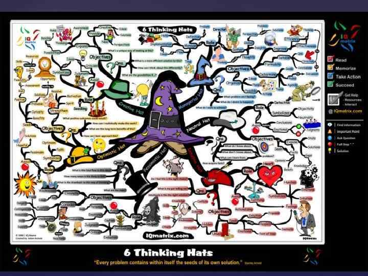 Six Thinking Hats Автор метода: Эдвард Боно Основа: параллельное мышление c целью получения объективной, разносторонней оценки для принятия решений Способ: Принятие человеком/группой разных позиций поочередно с помощью шляп разного цвета
