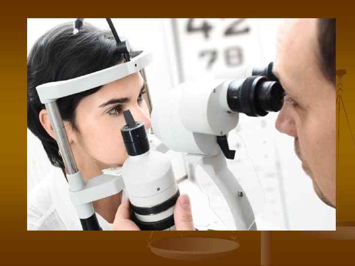 Глазное обследование на щелевой лампе n n Осмотр выполняется так. Врач и пациент сидят друг против друга, между ними столик со щелевой лампой. Высота инструмента устанавливается в центральном положении диапазона, окуляры подстраиваются под зрение наблюдателя (офтальмолога или оптометриста) и его межзрачковое расстояние (PD). Высота подголовника и приборного столика регулируется так, чтобы пациенту было удобно. Световой луч щелевой лампы направлен на глаз пациента. Если у пациента повышенная чуствительность к свету и осмотр вызывает дискомфорт, ему в глаза закапывают препараты для местной анестезии. Пучок света, проходящий через щелевую диафрагму, образует световой срез оптических структур глазного яблока. Именно этот оптический срез и рассматривает врач через микроскоп. При этом врач может менять ширину, длину и интенсивность светового луча. Меняя контрастности, виды освещения и фильтры, можно обнаружить под микроскопом самые мелкие изменения в тканях глаза. Чтобы лучше видеть повреждения, роговицу глаза окрашивают специальными красителями – флюоресцеином, лиссамином зелёным, бенгальским розовым.