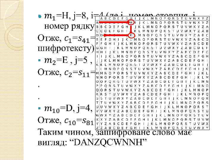 Приклад дешифрування § Нехай є зашифрований текст: С = “DANZQCWNNH” і ключ: K = “KEYKEYKEYK”
