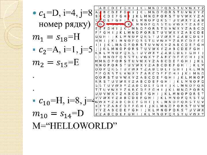 Приклад шифрування § Нехай є відкритий текст: М = "HELLOWORLD" і ключ: K = "KEY" § Довжина тексту = 10 символів, значить і довжина ключа також повинна бути рівною 10 символам. Тобто, K = "KEYKEYKEYK"