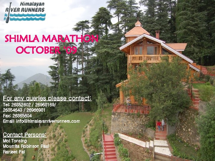 SHIMLA MARATHON OCTOBER ‘ 09 For any queries please contact: Tel: 26852602 / 26968169/ 26854643 / 26966981 Fax: 26865604 Email: info@himalayanriverrunners. com Contact Persons: Moi Tonsing Moumita Robinson Paul Ranjeet Pal
