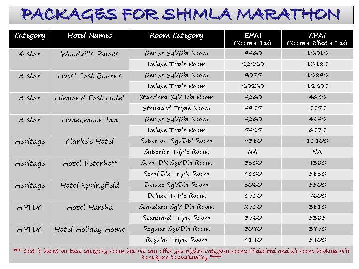 PACKAGES FOR SHIMLA MARATHON Category Hotel Names Room Category 4 star Woodville Palace 3 star EPAI CPAI (Room + Tax) (Room + B’fast + Tax) Deluxe Sgl/Dbl Room 9460 10010 Deluxe Triple Room 12110 13185 Hotel East Bourne Deluxe Sgl/Dbl Room 9075 10890 Deluxe Triple Room 10230 12305 3 star Himland East Hotel Standard Sgl/ Dbl Room 4260 4630 Standard Triple Room 4955 5555 3 star Honeymoon Inn Deluxe Sgl/Dbl Room 4260 4940 Deluxe Triple Room 5415 6575 Heritage Clarke’s Hotel Superior Sgl/Dbl Room 9380 11100 Superior Triple Room NA NA Heritage Hotel Peterhoff Semi Dlx Sgl/Dbl Room 3500 4380 Semi Dlx Triple Room 4600 5850 Heritage Hotel Springfield Deluxe Sgl/Dbl Room 5060 5500 Deluxe Triple Room 6710 7600 HPTDC Hotel Harsha Standard Sgl/ Dbl Room 2710 3810 Standard Triple Room 3760 5385 HPTDC Hotel Holiday Home Regular Sgl/Dbl Room 3090 3970 Regular Triple Room 4140 5400 *** Cost is based on base category room but we can offer you higher category rooms if desired and all room booking will be subject to availability ****