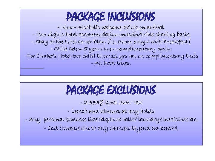 PACKAGE INCLUSIONS - Non – Alcoholic welcome drink on arrival - Two nights hotel accommodation on twin/triple sharing basis - Stay at the hotel as per Plan (i. e. Room only / with Breakfast) - Child below 5 years is on complimentary basis. - For Clarke’s Hotel two child below 12 yrs are on complimentary basis - All hotel taxes. PACKAGE EXCLUSIONS - 2. 575% Govt. Svc. Tax - Lunch and Dinners at any hotels - Any personal expenses like telephone calls/ laundry/ medicines etc. - Cost increase due to any changes beyond our control