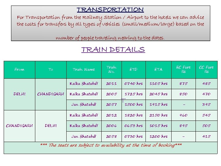 TRANSPORTATION For Transportation from the Railway Station / Airport to the hotels we can advice the costs for transfers by all types of vehicles (small/medium/large) based on the number of people traveling nearing to the dates. TRAIN DETAILS CHANDIGARH ETA EC Fare Rs CC Fare Rs 2011 0740 hrs 1105 hrs 875 485 Kalka Shatabdi 2005 1725 hrs 850 470 2057 T 1500 hrs 2045 hrs 1915 hrs - 395 2012 1820 hrs 2150 hrs 960 545 Kalka Shatabdi 2006 0653 hrs 1015 hrs 895 505 Jan Shatabdi DELHI ETD Kalka Shatabdi CHANDIGARH Train No. Jan Shatabdi DELHI To Train Name Kalka Shatabdi From 2058 0730 hrs 1200 hrs - 415 *** The seats are subject to availability at the time of booking***