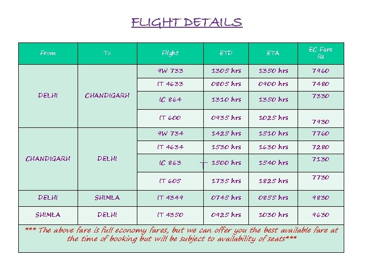 FLIGHT DETAILS 1350 hrs 7960 0805 hrs 0900 hrs 7480 IC 864 1310 hrs 1350 hrs 0935 hrs 1025 hrs 1425 hrs 1510 hrs 7760 1530 hrs 1630 hrs 7280 IC 863 1500 hrs 1540 hrs IT 605 DELHI 1305 hrs IT 4634 CHANDIGARH EC Fare Rs 9 W 734 CHANDIGARH ETA IT 600 DELHI ETD IT 4633 To Flight 9 W 733 From 1735 hrs 1825 hrs T 7330 7930 7130 7730 DELHI SHIMLA IT 4349 0745 hrs 0855 hrs 9830 SHIMLA DELHI IT 4350 0925 hrs 1030 hrs 9630 *** The above fare is full economy fares, but we can offer you the best available fare at the time of booking but will be subject to availability of seats***