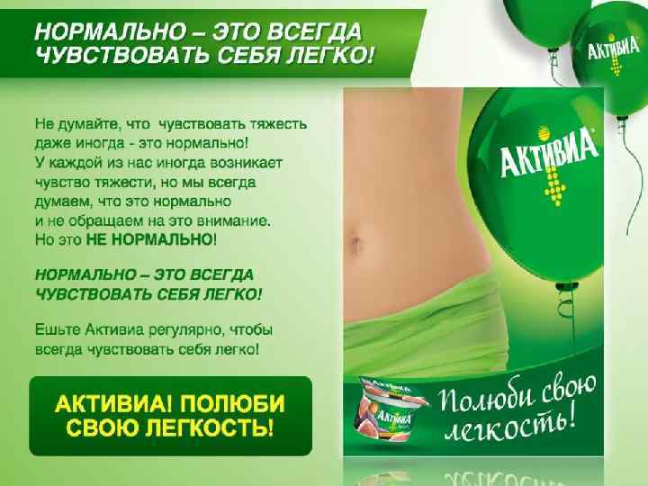 Био. Макс содержит био-комплекс специально подобранных природных компонентов, важных для пищеварения — Пектин и Инулин. КОНКУРЕНТЫ АКТИВИА ЧУДО Бренд компании Вимм-Биль-Данн, на рынке с 1998 года. Широкий портфель йогуртов и молочных десертов. Основа позиционирования – ВКУС! ДРУГИЕ ФУНКЦИОНАЛЬНЫЕ ПРОДУКТЫ Продукты, содержащие культуры, оказывающие полезное воздействие на организм. БИО-МАКС Бренд компании Вимм-Биль-Дан, на рынке с 1999 года, содержит био-комплекс природных компонентов, важных для пищеварения — Пектин и Инулин. Под маркой «Био. Макс» выпускается кефир, молоко, густые и питьевые йогурты и творожные десерты. КЕФИР Традиционный русский продукт, имеющий имидж продукта, оказывающего полезное воздействие на организм и пищеварение. Представлен как крупными брендами (Домик в деревне, Био Макс, Вкуснотеево, Веселый молочник) так и локальными марками. ЭРМАНН ПРЕБИОТИК Йогурты и творожки содержащие природный пребиотик – продукт растительного происхождения, который способствует росту собственных полезных бактерий и улучшению работы микрофлоры кишечника. КОНКУРЕНТНОЕ ПРЕИМУЩЕСТВО АКТИВИА нормализует пищеварение и улучшает микрофлору кишечника, имеет уникальные функциональные вкусы (инжир, мюсли-киви, слива-злаки ) КОНКУРЕНТНОЕ ПРЕИМУЩЕСТВО АКТИВИА Только Активиа содержит уникальные запатентованные бифидобактерии Актирегулярис, которые выживают в кислой среде кишечника. КОНКУРЕНТНОЕ ПРЕИМУЩЕСТВО АКТИВИА Удобный формат, доказанная эффективность в помоще пищеварению