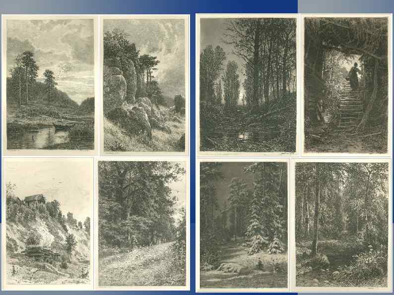 . В 1868 году выходит первый альбом его гравюр (шесть литографий) — «Этюды с натуры пером на камне» , а в мае 1873 года подготавливает и сам печатает первый альбом офортов (11 листов), выпущенный в качестве премии «Общества поощрения художников» . Следующие две папки выходят в 1878 и в 1886 годах, ну и , как кульминация, в 1894 году выходит альбом « 60 офортов И. И. Шишкина. 1870 — 1892» (изд. А. Ф. Маркса, Спб. )