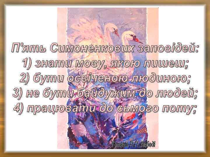 • Шістдесятники виступали на захист національної мови і культури, свободи художньої творчості. Основу руху шістдесятників склали письменники Іван Драч, Микола Вінграновський, Василь Симоненко, Ліна Костенко, В. Шевчук, Є. Гуцало, художники Алла Горська, Віктор Зарецький, літературні критики Іван Дзюба, Євген Сверстюк, режисер Лесь Танюк, кінорежисери Сергій Параджанов, Юрій Іллєнко, перекладачі Григорій Кочур, Микола Лукаш та інші. • Шістдесятники протиставляли себе офіційному догматизмові, сповідували свободу творчого самовираження, культурний плюралізм, пріоритет загальнолюдських цінностей над класовими. Значний вплив на їх становлення справила західна гуманістична культура, традиції «розстріляного відродження» та здобутки української культури кінця ХІХ — початку ХХ ст.