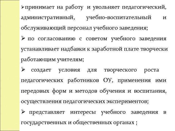 Ø принимает на работу и увольняет педагогический, административный, учебно-воспитательный и обслуживающий персонал учебного заведения; Ø по согласованию с советом учебного заведения устанавливает надбавки к заработной плате творчески работающим учителям; Ø создает условия для творческого роста педагогических работников ОУ, применения ими передовых форм и методов обучения и воспитания, осуществления педагогических экспериментов; Ø представляет интересы учебного заведения в государственных и общественных органах ;