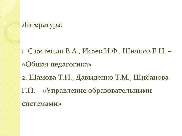 Литература: 1. Сластенин В. А. , Исаев И. Ф. , Шиянов Е. Н. – «Общая педагогика» 2. Шамова Т. И. , Давыденко Т. М. , Шибанова Г. Н. – «Управление образовательными системами»