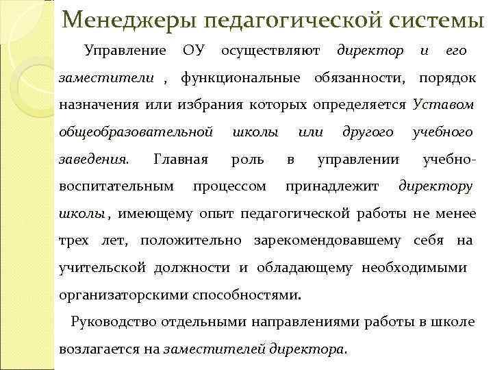 Менеджеры педагогической системы Управление ОУ осуществляют директор и его заместители , функциональные обязанности, порядок назначения или избрания которых определяется Уставом общеобразовательной школы или другого учебного заведения. Главная роль в управлении учебно- воспитательным процессом принадлежит директору школы , имеющему опыт педагогической работы не менее трех лет, положительно зарекомендовавшему себя на учительской должности и обладающему необходимыми организаторскими способностями. Руководство отдельными направлениями работы в школе возлагается на заместителей директора.