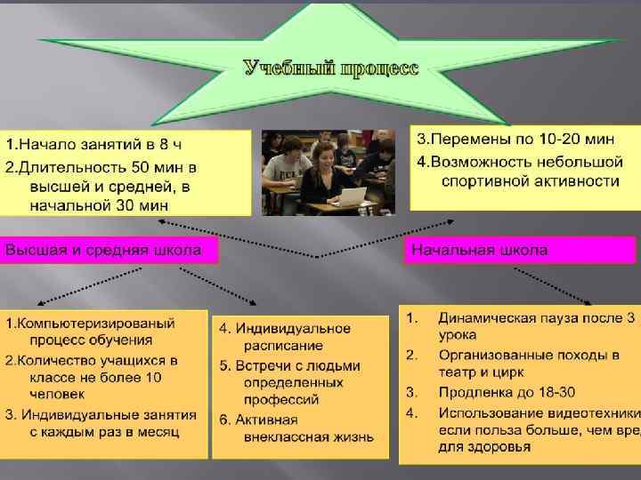 Высшая школа! ► Ученики могут определять для себя приоритеты в изучаемых дисциплинах. Школьник имеет собственное расписание на каждый день. У школ есть свое имя, традиции и эмблемы. Автоматическая отправка данных об ученике в ВУЗы. Использование техники во время занятий