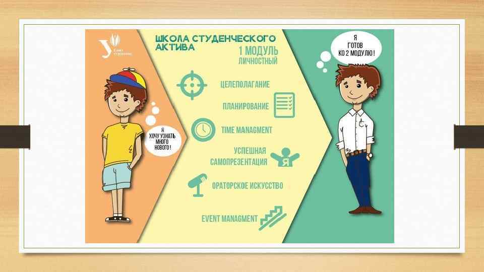 Программа 1 модуля 14 октября: Успешная самопрезентация 15 октября: Тайм-менеджмент 20 октября: Ораторское искусство 21 октября: Творческое мышление и основы event-менеджмента Лекция про лидерство на английском языке 22 октября: ораторское искусство 26 октября: Самомотивация. Успех близко, но к нему нужно идти самому 28 октября: Творческое мышление и основы event-менеджмента Целеполагание и планирование 29 октября: Лидерство 30 -31 октября: You. Lead | Форум молодых лидеров