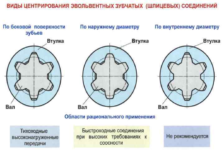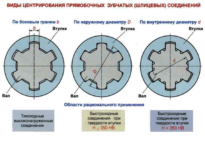 1. Соединения с прямобочными зубьями выполняют с центрированием по боковым граням, по наружному и внутреннему диаметрам вала. Стандартом предусмотрены три серии соединений (легкая, средняя и тяжелая), которые отличаются высотой и количеством зубьев. Число зубьев изменяется в пределах от 6 до 20. У соединений тяжелой серии зубья выше, а их количество больше, чем у соединений средней и легкой серии.