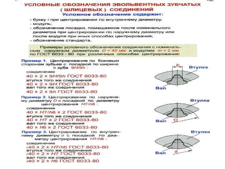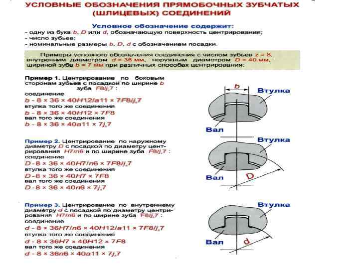 Посадка шлицевых соединений 1. Соединение с зазором (для хода детали): а) центрирующий диаметр d или D б) нецентрирующий диаметр D или d в) ширина b 2. Соединение с переходными посадками (для крепления деталей): а) центрирующий диаметр d или D б) нецентрирующий диаметр D или d в) ширина b