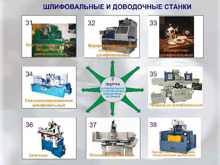 Классификация станков • Шлифовальные станки( 3_я группа) Станок Группа Круглошлифовальные станки для наружного шлифования(тип 1) типоразмер 51 52 53 И т. д. диаметр 200 130 длина 750 500 типоразмер Внутришлифовальные станки (тип 2) типоразмер 25 27 40 И т. д. Плоскошлифовальные станки (тип 3) типоразмер 21 33 -35 3 М 152 характеристики Горизонт. шпинд. , прямоуг. стол Верт. шпинд. , прямоуг. стол 41 Горизонт. шпинд. , круглый. стол 22, 56 Верт. шпинд. , круглый стол диаметр 6 -25 25 -100 12 -100 длина 50 125 130 Станки для отделочных операций(тип 8) Пример: Станок 38 хх