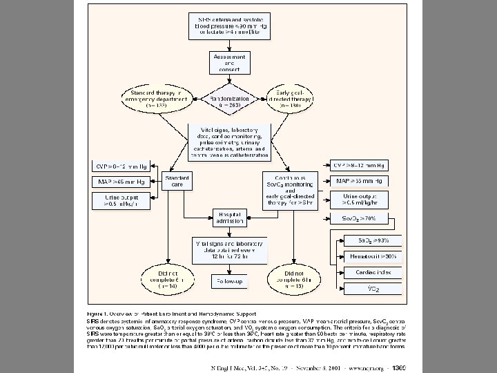 Η συμβολή της μέτρησης του Sv. O 2 στην αντιμετώπιση σηπτικού shock • Η πρώιμη κατευθυνόμενη παρέμβαση περιλάμβανε: – Τη διασωλήνωση του ασθενή εάν ήταν απαραίτητο και την εισαγωγή κεντρικού φλεβικού καθετήρα – Τη χορήγηση bolus 500 ml κρυσταλοειδών διαλυμάτων ώστε να επιτευχθει CVP=8 -12 mm. Hg – Τη χορήγηση ινότροπων ώστε ΜΑΠ ≥ 65 mm. Hg – Αν Sv. O 2 ήταν μικροτερη από 70% τότε: • χορηγούνταν μεταγγίσεις μεχρι Ht=30% • χορηγούνταν ινότροποι παράγοντες – Η όλη παρέμβαση έπρεπε να έχει ολοκληρωθεί σε έξι ώρες και λάμβανε χώρα στο χώρο των επειγόντων περιστατικών, πριν την εισαγωγή του ασθενή