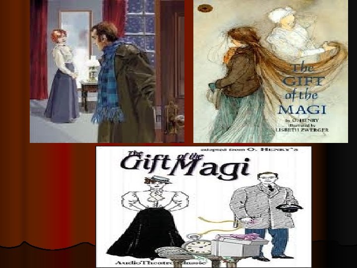 The plot When Jim arrive and shocked by Dell’s short Hair , and she didn’t no his looks what mean climax The only solution is selling her long Hair in hair shop She was thinking how to earn money In front of the window Della opens the present, and Finds it combs to her hair Della gives her husband the chain , But he sells the watch to buy Della’s present Initial situation The story starts with sentence “one dollar and 87 cents” That was all. So the story starts with problem Denouement Jim smiles , puts present away , and they have The dinner. The narrator Says they are the magi