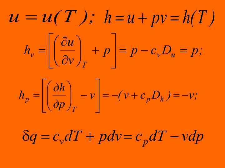 Калорические коэффициенты по физическому смыслу являются аналогами теплоемкостей в изотермическом процессе. Данную запись первого начала называют аналитическим выражением первого начала термодинамики для простого тела. Первое начало термодинамики для идеальных газов. Закон Майера. Энтропия идеального газа Идеальные газы подчиняются уравнению состояния Клапейрона и закону Джоуля, согласно которому удельная внутренняя энергия идеального газа зависит только от температуры