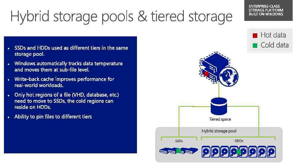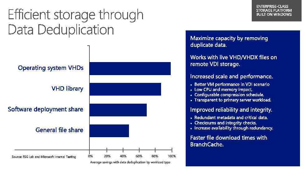 VHDX Provides Increased Scale, Protection & Alignment Features • Storage capacity up to 64 TBs • Corruption protection during power failures • Optimal structure alignment for large-sector disks Benefits • Increases storage capacity • Protects data • Helps to ensure quality performance on large-sector disks Large allocations and 1 MB aligned Intent log Header region Data region (large allocations and 1 MB aligned) Block Allocation Table (BAT) User data blocks Sector bitmap blocks Metadata region (small allocations and unaligned) User metadata Header Metadata table File metadata