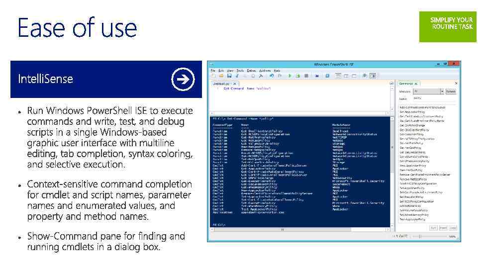 Server Core Minimal Server Interface Server with a GUI Desktop Experience Command Prompt a a Power. Shell/. NET a a Server Manager x a a a MMC x a a a Control Panel x x a a CPL Applets x Some a a Explorer Shell x x a a Taskbar x x a a System Tray x x a a Internet Explorer x x a a Help x x a a Themes x x x a Start screen (Metro) x x a a Metro-style apps x x x a Media Player x x x a
