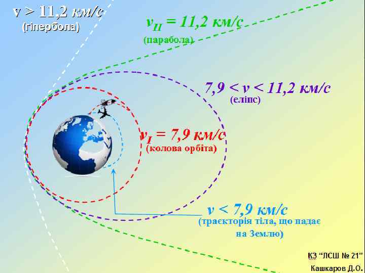Штучний супутник Землі – це тіло, яке рухається на певній висоті над поверхнею Землі по коловій орбіті. Швидкість, за якою тіло, що кинуте горизонтально, починає обертатися по колу навколо Землі поблизу її поверхні, називається першою космічною швидкістю. КЗ “ЛСШ № 21” Кашкаров Д. О.