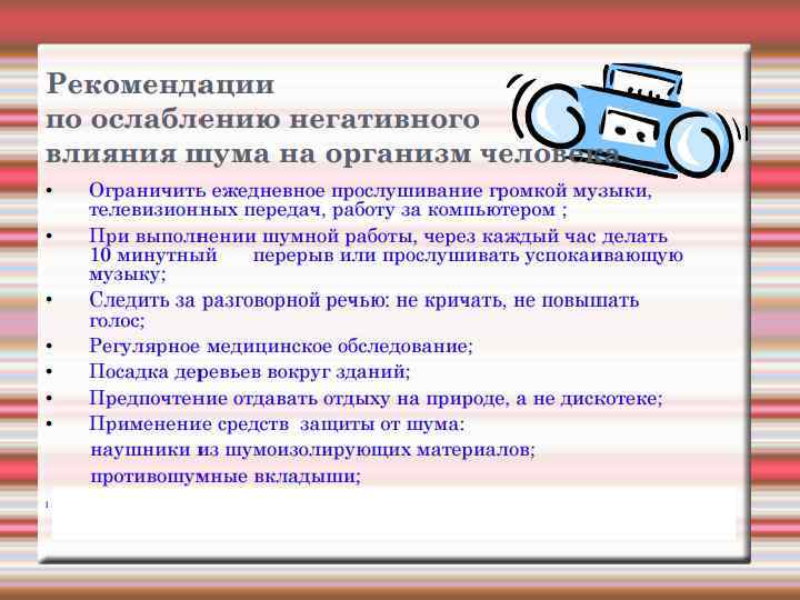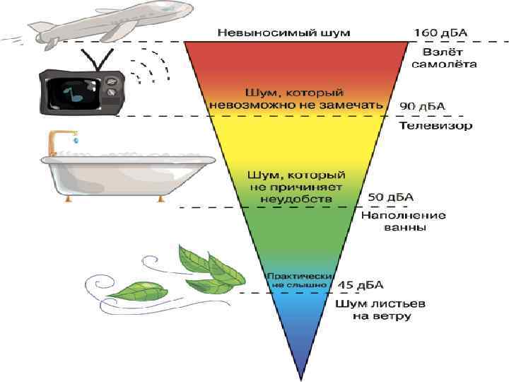 Физические характеристики шума. Уровень шума измеряется в единицах звукового давления децибеллах (д. Б). Болевой порог 160 д. Б Ракетный двигатель 140 д. Б Громкая музыка 120 д. Б Метро 100 д. Б Уровень шума, вредный для уха 90 д. Б Товарный поезд (на расстоянии 33 м) 80 д. Б Автомобильное движение на автостраде 60 д. Б Громкий разговор в классе 40 д. Б Шелест листвы 10 д. Б Девчачий визг 127 д. Б