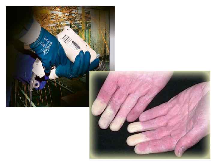 • На фоне нарушения капиллярного кровообращения резко нарушаются функции нервной системы. • Изменяются все виды чувствительности (тактильная, температурная), развиваются парестезии (покалывания, чувство носков, перчаток, ползание мурашек). • У больных появляются боли, по разному сочетающиеся с сосудистыми явлениями (атония — багрово синюшная кисть, при спазме — резкое побледнение — симптом мертвых пальцев, мертвой кисти). Эти явления могут возникать при действии вибрации, а также во время сна.