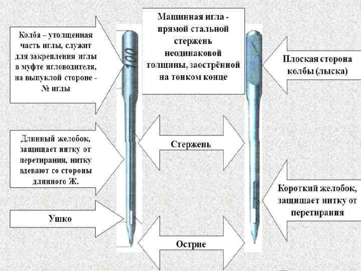 Устройство машинной иглы - прямой стальной стержень неодинаковой толщины, заостренный на тонком конце 1. Колба 2. Стержень 3. Остриё 4. Плоская сторона колбы 5. Длинный желобок 6. Ушко 7. Короткий желобок