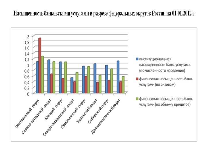 Обеспеченность банковскими услугами потребителей в разрезе федеральных округов Денежные доходы на душу населения ( в руб. ) 01. 2011 01. 2012 Индекс развития сберегательного дела (вклады на душу населения) 01. 2011 01. 2012 Центральный федеральный округ 24 525 25 814 1, 43 1, 48 1, 39 1, 41 Северо-западный федеральный округ 19 741 21 625 1, 13 1, 10 1, 01 0, 98 Южный федеральный округ Северо-Кавказский федеральный округ 15 032 16 395 0, 71 0, 80 13 249 15 273 0, 32 0, 47 Приволжский федеральный округ 15 697 16 917 0, 76 0, 79 0, 78 Уральский федеральный округ 21 586 22 839 0, 77 0, 78 0, 65 Сибирский федеральный 14 892 округ 20 809 Дальневосточный федеральный округ 18 881 Российская федерация 16 353 0, 68 0, 70 23 207 0, 79 0, 78 0, 65 0, 66 20 475 1, 0 Источник: данные Банка России Совокупный индекс обеспеченности региона банковскими услугами 01. 2011 01. 2012