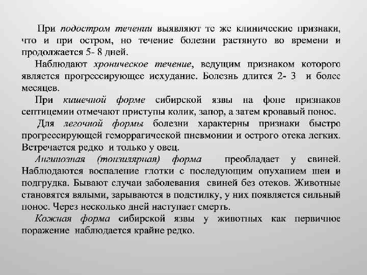 Течение и симптомы Характер течения и формы болезни зависят от места проникновения возбудителя, его вирулентности и резистентности организма. Инкубационный период длится 1 -3 дня. При молниеносном течении отмечают возбуждение. Заболевание возникает внезапно. Животное шатается, падает, теряет сознание, дыхание затрудняется, видимые слизистые оболочки становятся сине-красными. Смерть наступает быстро, через несколько часов. Смертность достигает 100%.